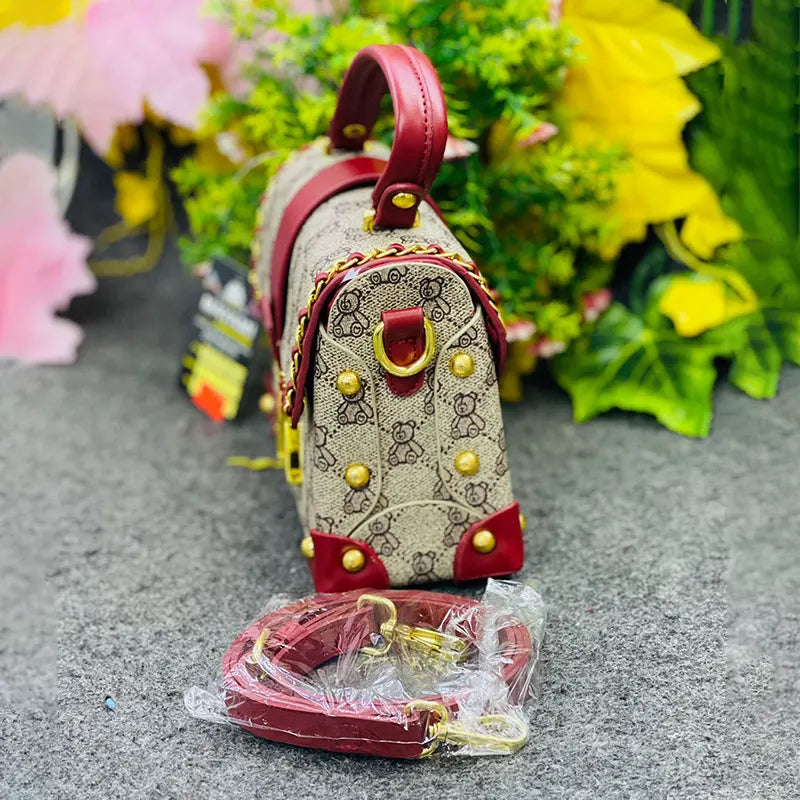 Luxury Monogrammed Handbag with Burgundy Accents & Gold Stud Detailing
